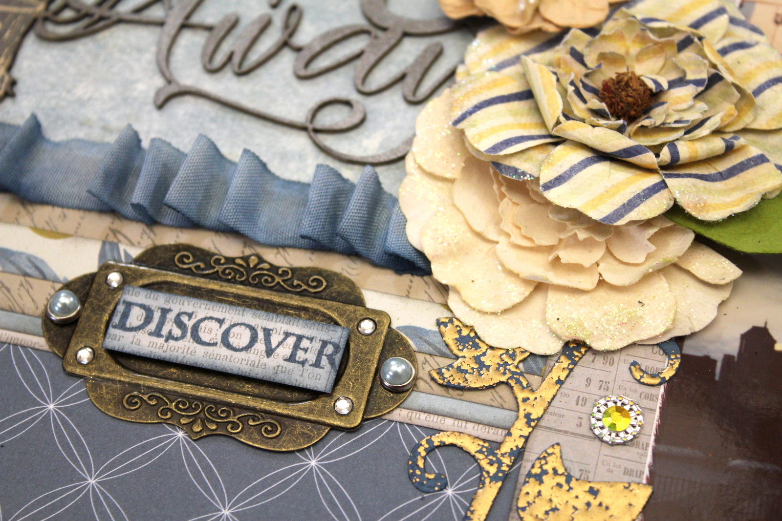 the label is a gorgeous metal piece from Fabscraps. i stamped the word "discover" in the blue Luxe ink onto some of the Antiquities paper and cut it out. i raised it and added it to the metal label.