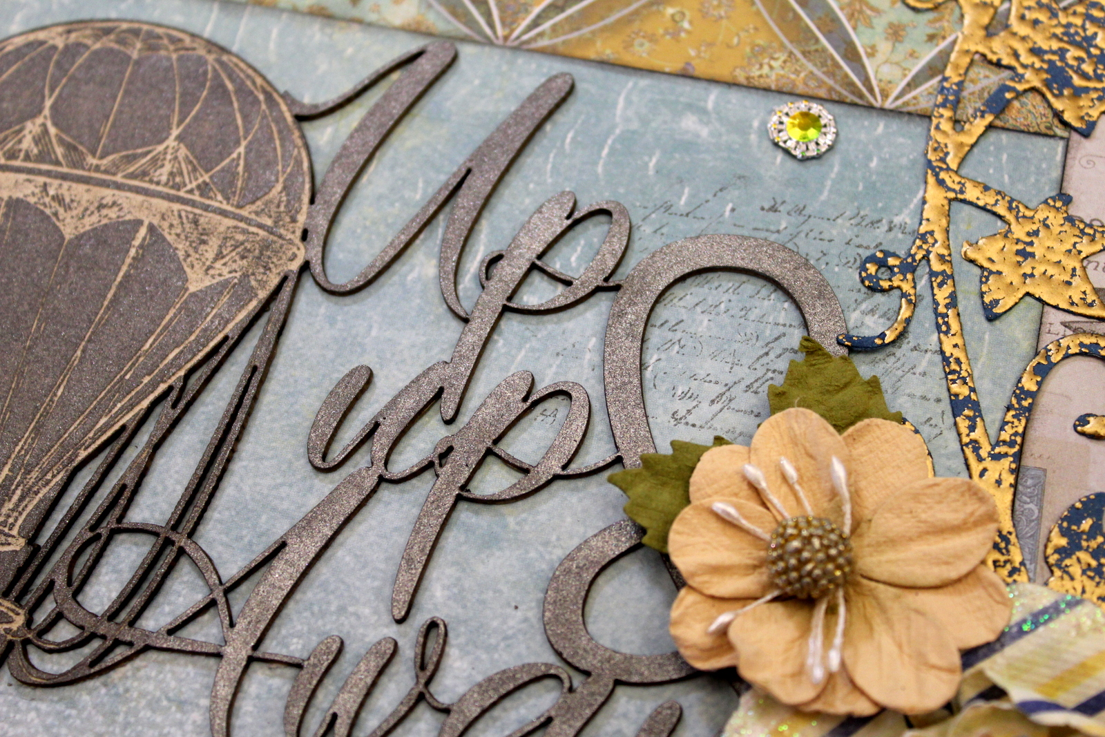 i chose to use a Scrap Collections Chipboard title - Up Up & Away. i love this title. i simply inked it with Delicata Black Shimmer Ink. nothing else was added to it. i have also been dying to use an ivy Sizzix cutting die i have - it is a 12" border die that i don't think they make anymore. i have had it for many years. i cut it from white cardstock and then inked it with Memento Luxe Nautical Blue. while the ink was still wet, i sprinkled it with Gold Embossing Powder and melted it with my heat tool. because the ink had dried in random areas, the powder only adhered to selected areas and the blue is revealed under the Gold Embossed areas. i love that.