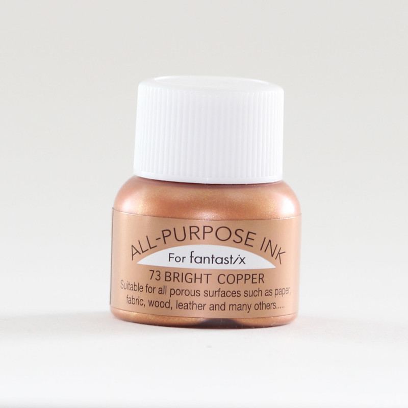 ALL PURPOSE INK - Copper Vivid colours for all of your crafting projects. Ink will not cake and fabrics remain soft. Perfect for coloring textiles, ideal for quilt work. • Brilliant ink colors dry without caking - fabrics remain soft. • Perfect for use on quilting projects. • Made for use with Fantastix coloring tool. Place the tip of the Fantastix into a bottle of API. The Fantastix will soak the ink into its barrel, allowing the tool to be used like a pen. • Heat set on textiles with an iron. • Always test on a scrap piece of material before using on final project. Application: • Fabric • Unpainted wood • Uncoated paper • Ueather(tanned leather) • Unglazed pottery Drying time: Apply heat source for 15 seconds (iron or hair dryer). Varies based on material, humidity, etc.