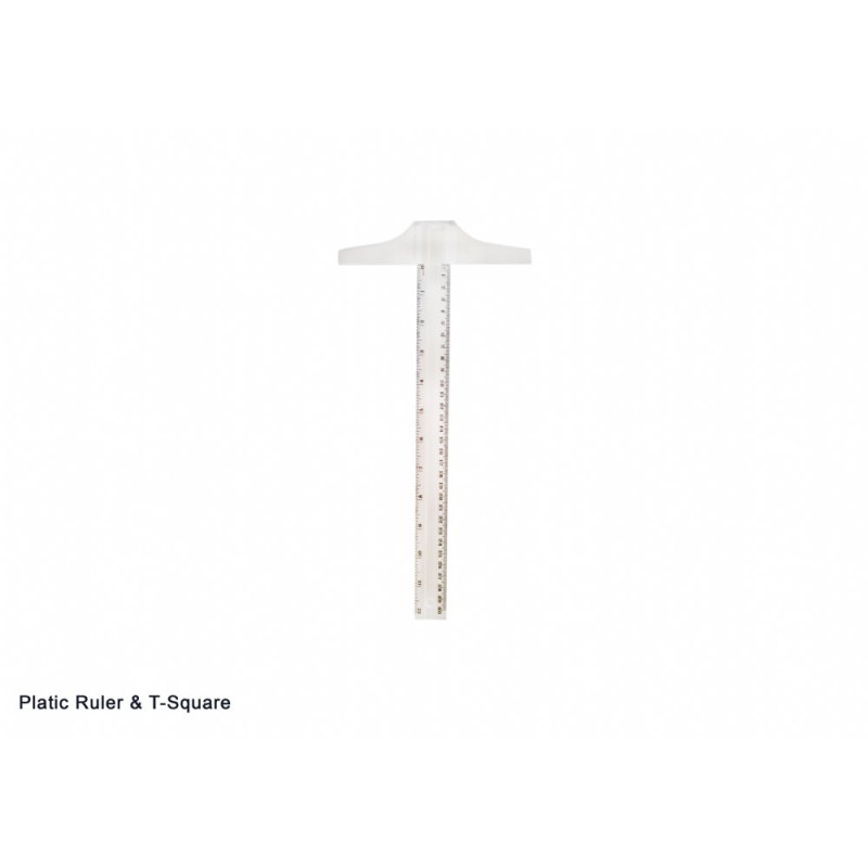 A T-shaped ruler, used primarily in mechanical drawing, having a short crosspiece that slides along the edge of the drawing board as a guide to the perpendicular longer section in making parallel lines, right angles, etc., and as a support for triangles.